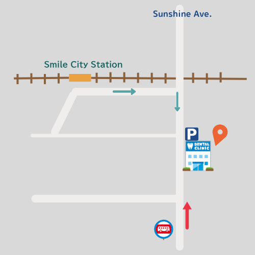 徒歩でのアクセス: Smile City Stationから東へ約10分歩くと、Sunshine Avenueに到着します。そこを右に曲がり、さらに5分歩くとクリニックが左手にあります。